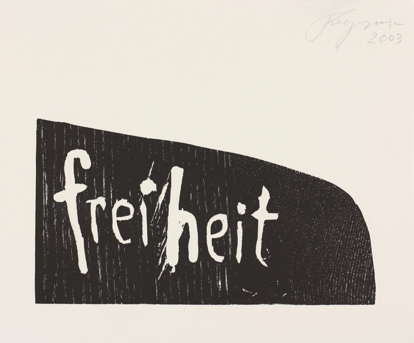 Eine Brücke über den gesamten Ausstellungszeitraum schlägt der Berliner Graphiker Thomas Kilpper, der durch seine gesellschaftskritischen und politischen Interventionen bekannt wurde. Er besetzt von Beginn an den Eingangsraum mit seinen das Thema Kunst und Freiheit umspielenden Arbeiten, die eigens für Viersen entstanden.